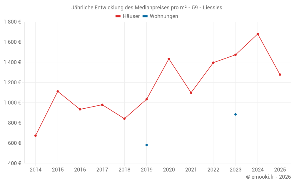 Der Durchschnittspreis auf den 15 Hausgeschäften der letzten 24 Monate in der Gemeinde Liessies betrug 1 434 € pro Quadratmeter für einen mittleren Immobilienwert von 71 850 €. Über diesen Zeitraum hinweg lagen 60% der Transaktionen zwischen 1 045 und 1 929 € pro Quadratmeter (vom 2. bis zum 8. Dezil).