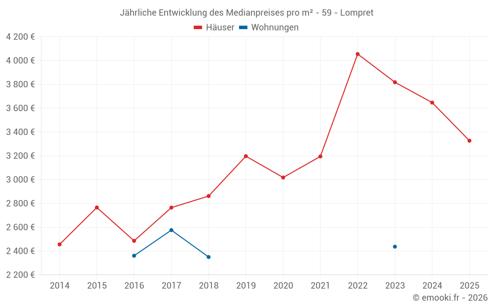 Der Durchschnittspreis auf den 23 Hausgeschäften der letzten 12 Monate in der Gemeinde Lompret betrug 3 504 € pro Quadratmeter für einen mittleren Immobilienwert von 417 250 €. Über diesen Zeitraum hinweg lagen 60% der Transaktionen zwischen 3 025 und 4 227 € pro Quadratmeter (vom 2. bis zum 8. Dezil).
