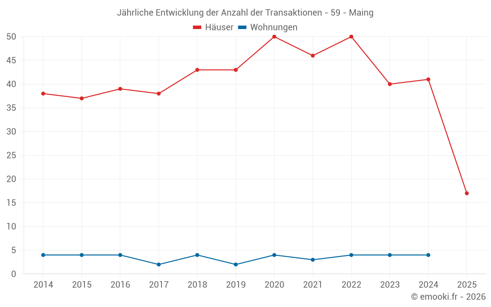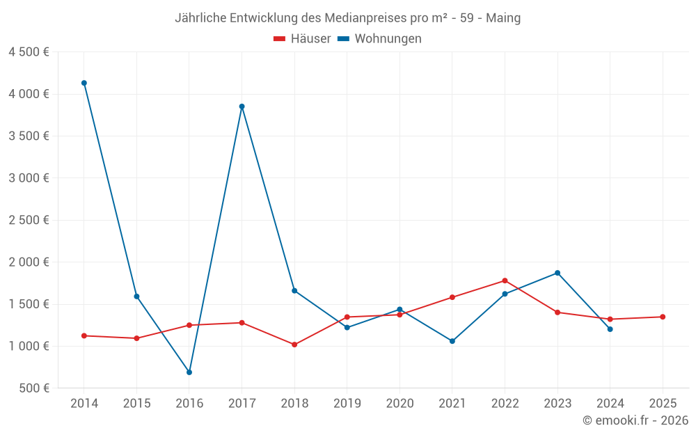Der Durchschnittspreis auf den 35 Hausgeschäften der letzten 12 Monate in der Gemeinde Maing betrug 1 349 € pro Quadratmeter für einen mittleren Immobilienwert von 132 420 €. Über diesen Zeitraum hinweg lagen 60% der Transaktionen zwischen 725 und 1 778 € pro Quadratmeter (vom 2. bis zum 8. Dezil).