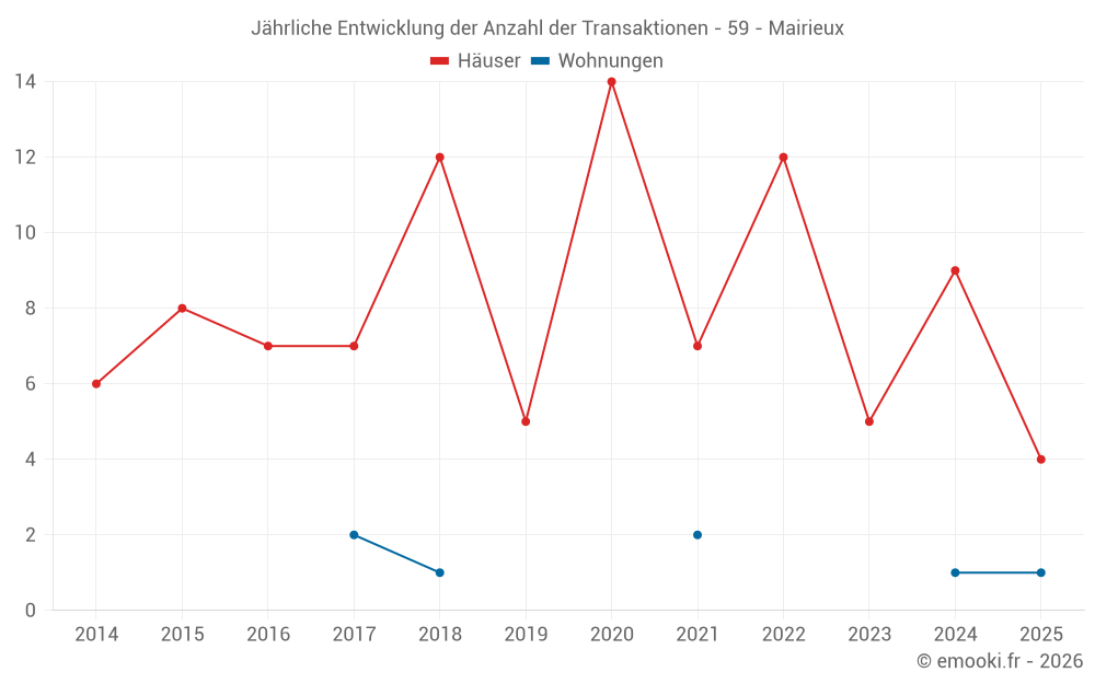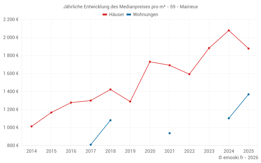 Der Durchschnittspreis auf den 15 Hausgeschäften der letzten 24 Monate in der Gemeinde Mairieux betrug 1 882 € pro Quadratmeter für einen mittleren Immobilienwert von 206 000 €. Über diesen Zeitraum hinweg lagen 60% der Transaktionen zwischen 1 610 und 2 330 € pro Quadratmeter (vom 2. bis zum 8. Dezil).