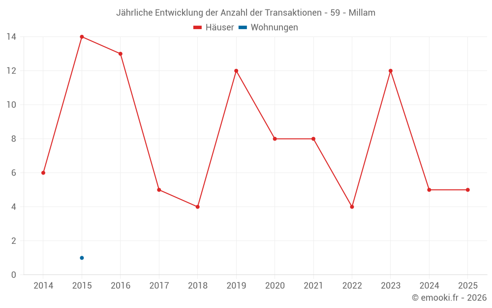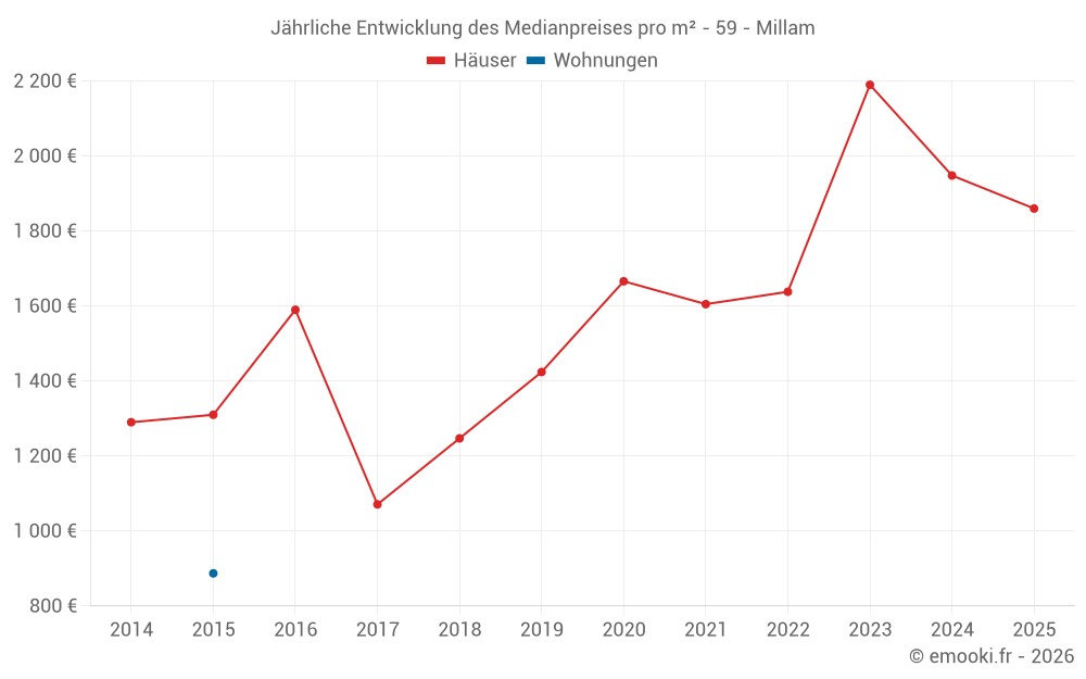 Der Durchschnittspreis auf den 16 Hausgeschäften der letzten 24 Monate in der Gemeinde Millam betrug 1 986 € pro Quadratmeter für einen mittleren Immobilienwert von 216 000 €. Über diesen Zeitraum hinweg lagen 60% der Transaktionen zwischen 1 665 und 2 458 € pro Quadratmeter (vom 2. bis zum 8. Dezil).
