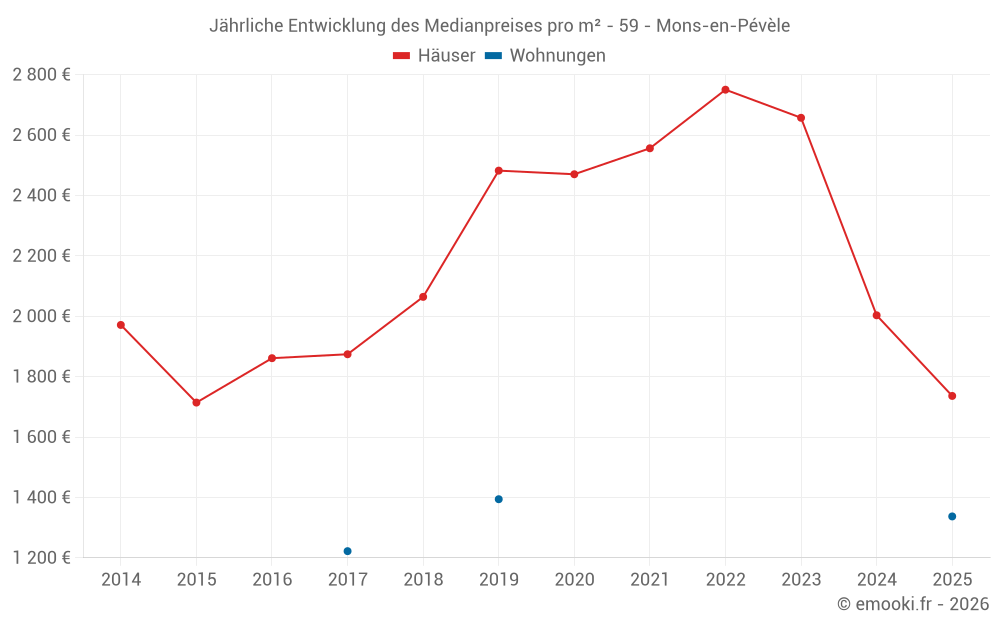 Der Durchschnittspreis auf den 17 Hausgeschäften der letzten 12 Monate in der Gemeinde Mons-en-Pévèle betrug 2 018 € pro Quadratmeter für einen mittleren Immobilienwert von 200 000 €. Über diesen Zeitraum hinweg lagen 60% der Transaktionen zwischen 1 554 und 3 032 € pro Quadratmeter (vom 2. bis zum 8. Dezil).