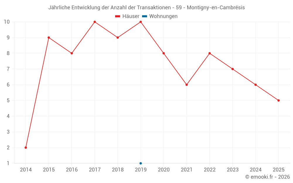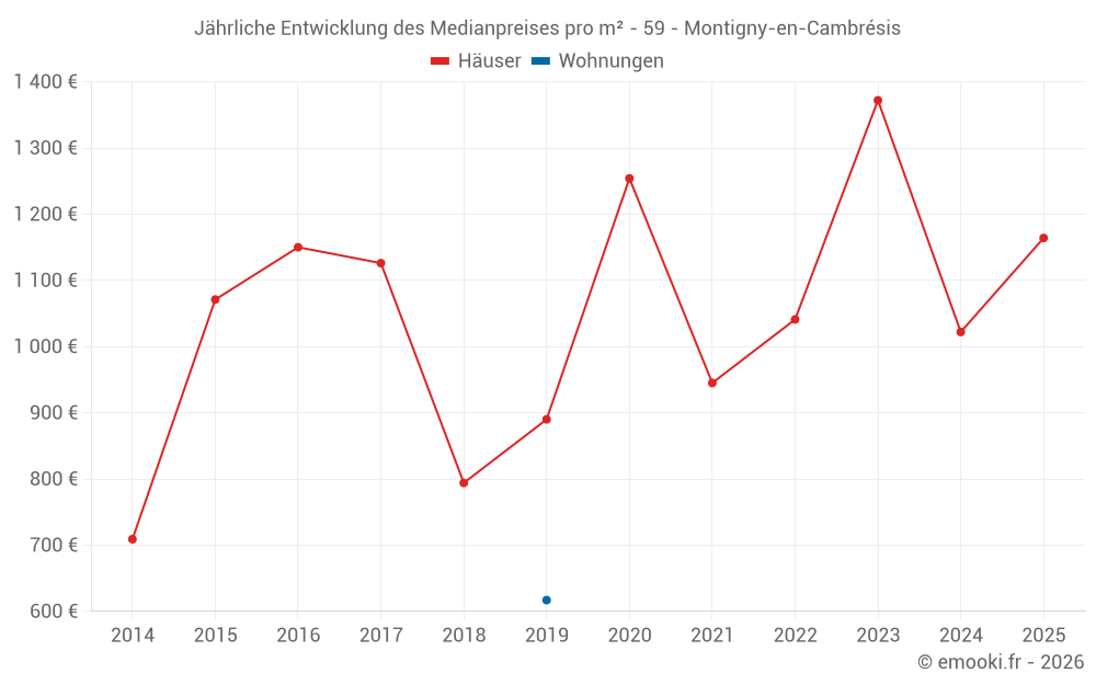 Der Durchschnittspreis auf den 14 Hausgeschäften der letzten 24 Monate in der Gemeinde Montigny-en-Cambrésis betrug 1 250 € pro Quadratmeter für einen mittleren Immobilienwert von 131 500 €. Über diesen Zeitraum hinweg lagen 60% der Transaktionen zwischen 697 und 1 580 € pro Quadratmeter (vom 2. bis zum 8. Dezil).
