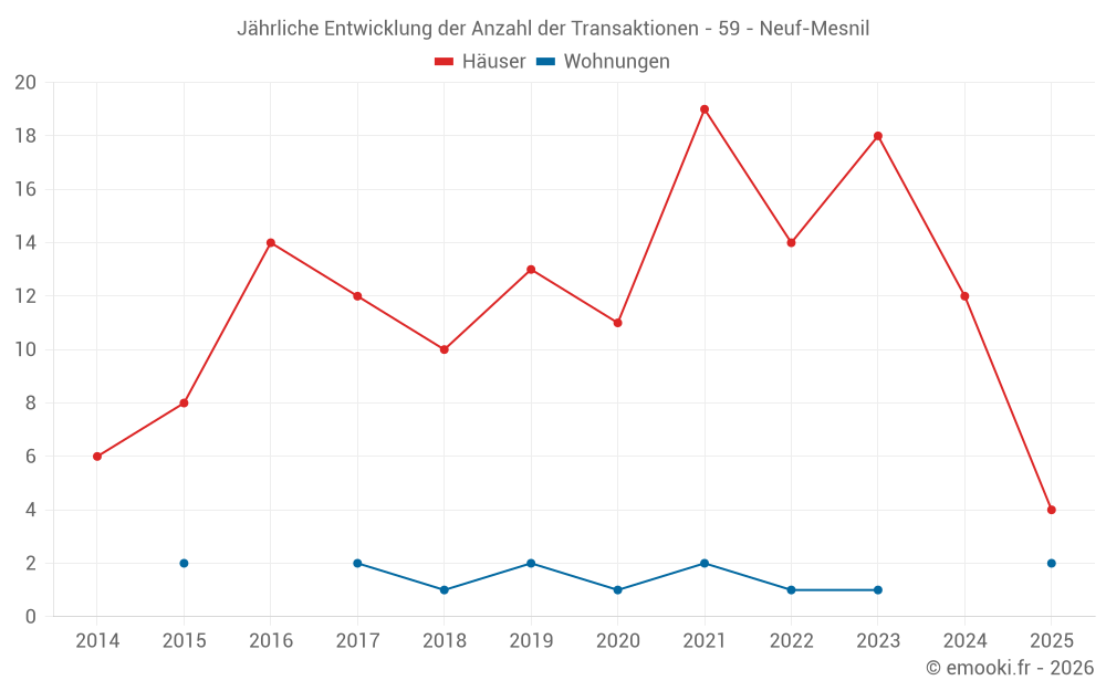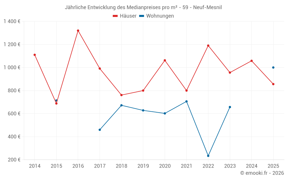 Der Durchschnittspreis auf den 26 Hausgeschäften der letzten 24 Monate in der Gemeinde Neuf-Mesnil betrug 898 € pro Quadratmeter für einen mittleren Immobilienwert von 93 000 €. Über diesen Zeitraum hinweg lagen 60% der Transaktionen zwischen 642 und 1 496 € pro Quadratmeter (vom 2. bis zum 8. Dezil).