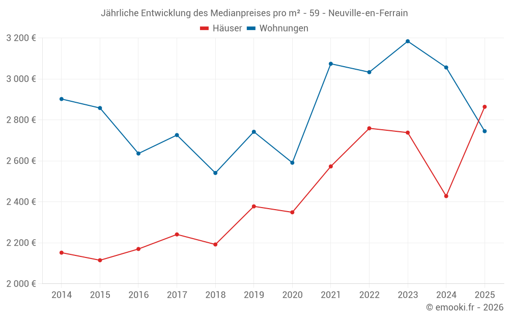 Der Durchschnittspreis auf den 15 Wohnungstransaktionen der letzten 24 Monate in der Gemeinde Neuville-en-Ferrain betrug 2 976 € pro Quadratmeter für einen mittleren Immobilienwert von 206 000 €. Über diesen Zeitraum hinweg lagen 60% der Transaktionen zwischen 2 623 und 3 178 € pro Quadratmeter (vom 2. bis zum 8. Dezil).