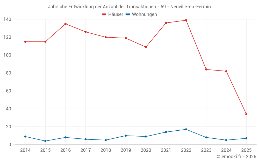 Der Durchschnittspreis auf den 34 Hausgeschäften der letzten 6 Monate in der Gemeinde Neuville-en-Ferrain betrug 2 864 € pro Quadratmeter für einen mittleren Immobilienwert von 247 145 €. Über diesen Zeitraum hinweg lagen 60% der Transaktionen zwischen 2 075 und 3 221 € pro Quadratmeter (vom 2. bis zum 8. Dezil).