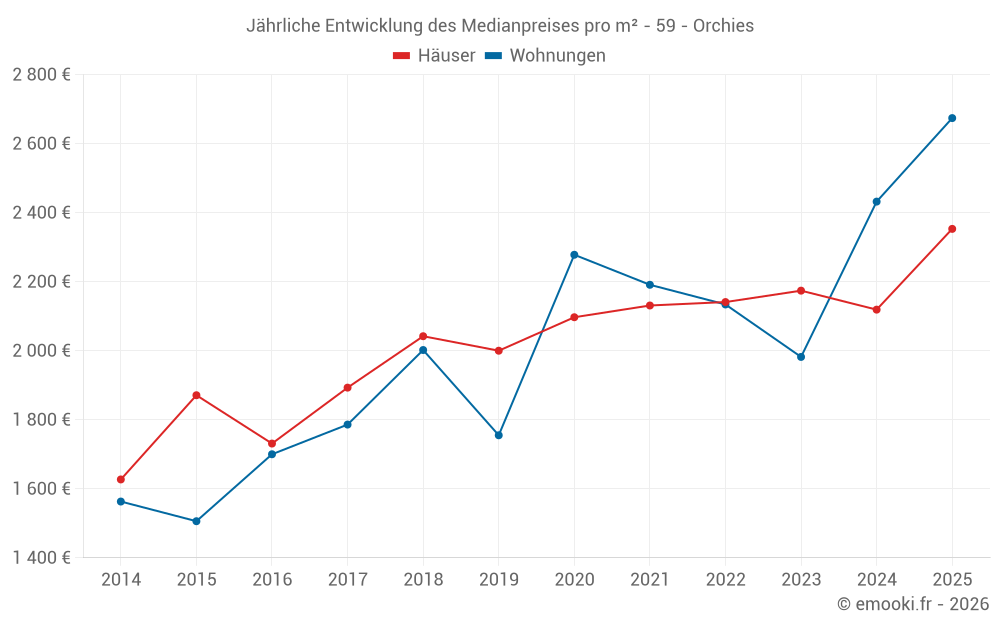 Der Durchschnittspreis auf den 23 Wohnungstransaktionen der letzten 24 Monate in der Gemeinde Orchies betrug 2 357 € pro Quadratmeter für einen mittleren Immobilienwert von 129 500 €. Über diesen Zeitraum hinweg lagen 60% der Transaktionen zwischen 1 753 und 2 706 € pro Quadratmeter (vom 2. bis zum 8. Dezil).