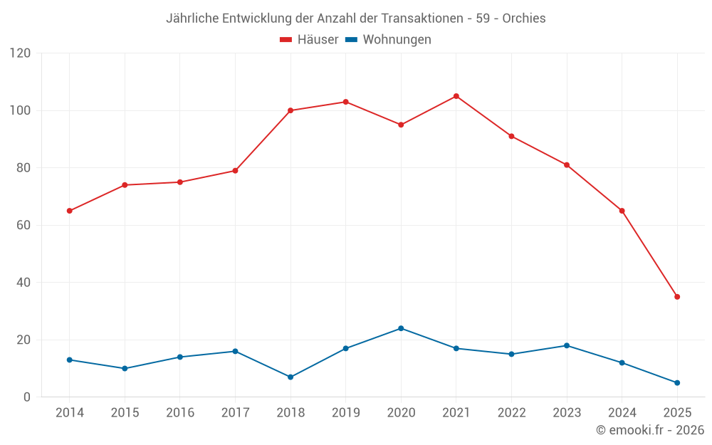 Der Durchschnittspreis auf den 35 Hausgeschäften der letzten 6 Monate in der Gemeinde Orchies betrug 2 353 € pro Quadratmeter für einen mittleren Immobilienwert von 202 700 €. Über diesen Zeitraum hinweg lagen 60% der Transaktionen zwischen 1 725 und 2 755 € pro Quadratmeter (vom 2. bis zum 8. Dezil).