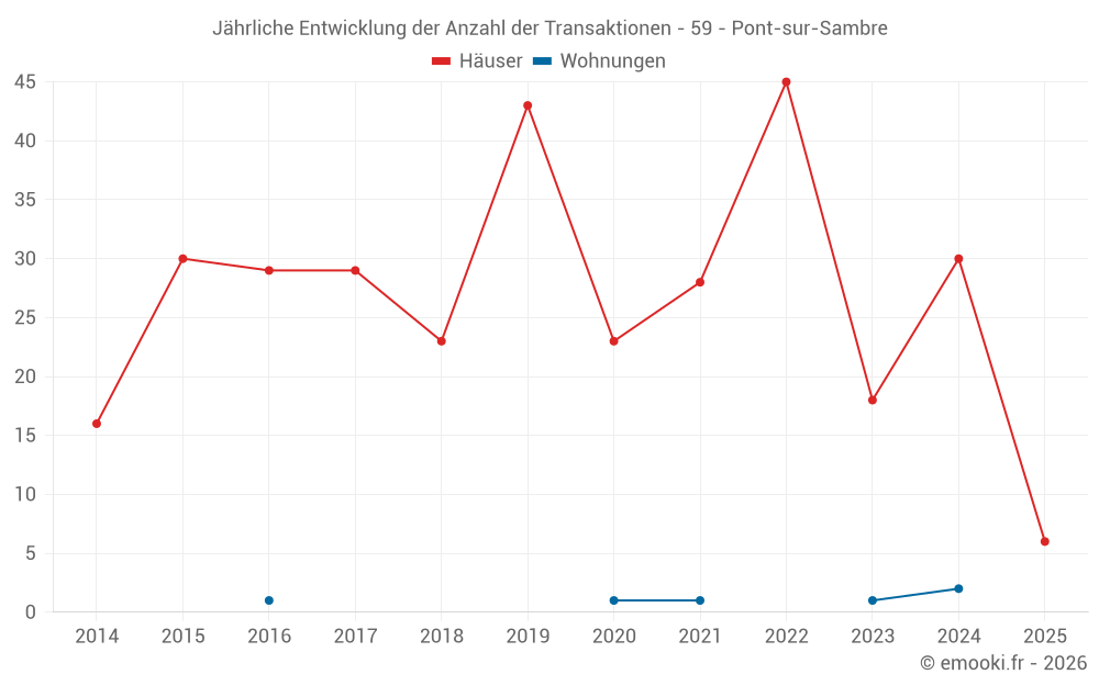 Der Durchschnittspreis auf den 26 Hausgeschäften der letzten 12 Monate in der Gemeinde Pont-sur-Sambre betrug 1 190 € pro Quadratmeter für einen mittleren Immobilienwert von 111 500 €. Über diesen Zeitraum hinweg lagen 60% der Transaktionen zwischen 843 und 1 567 € pro Quadratmeter (vom 2. bis zum 8. Dezil).