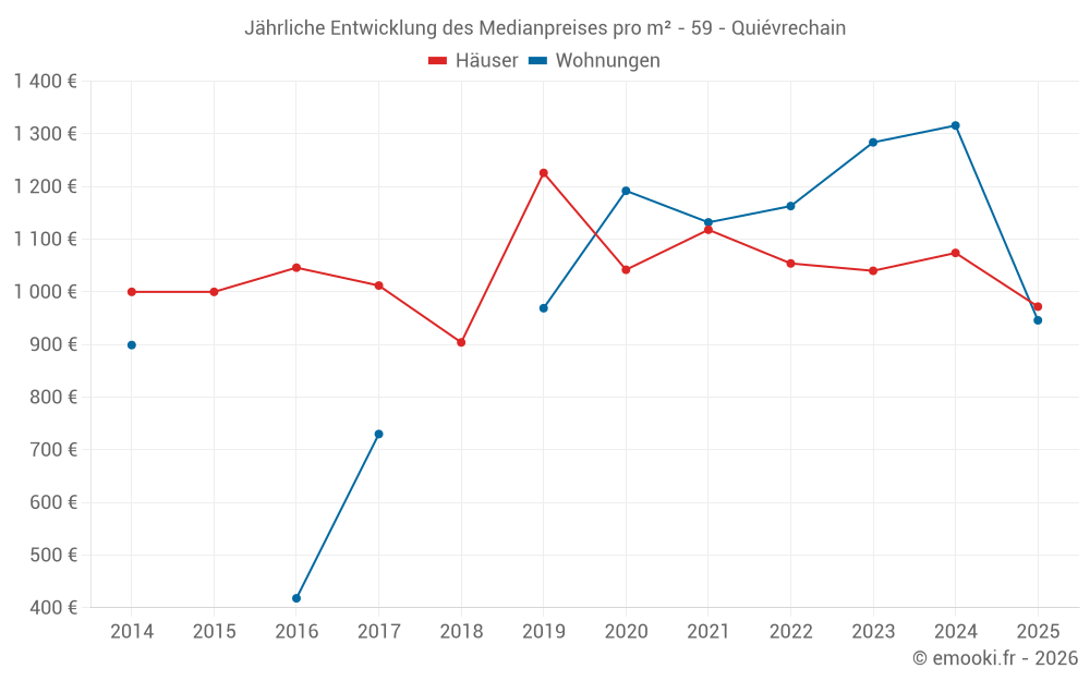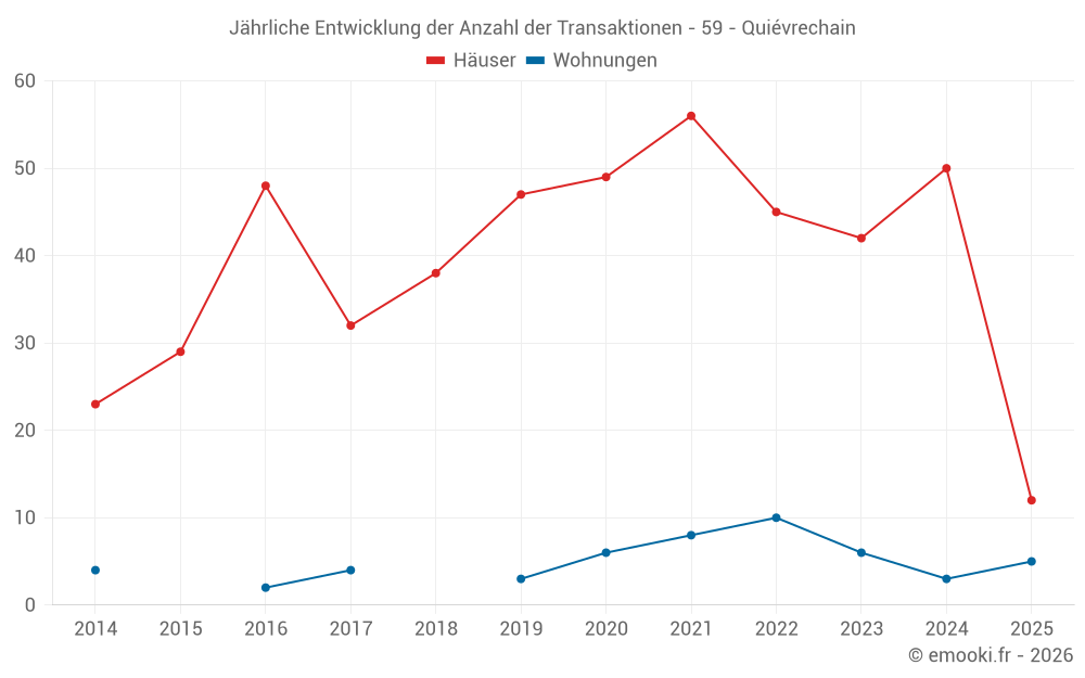 Der Durchschnittspreis auf den 40 Hausgeschäften der letzten 12 Monate in der Gemeinde Quiévrechain betrug 1 037 € pro Quadratmeter für einen mittleren Immobilienwert von 95 000 €. Über diesen Zeitraum hinweg lagen 60% der Transaktionen zwischen 874 und 1 527 € pro Quadratmeter (vom 2. bis zum 8. Dezil).