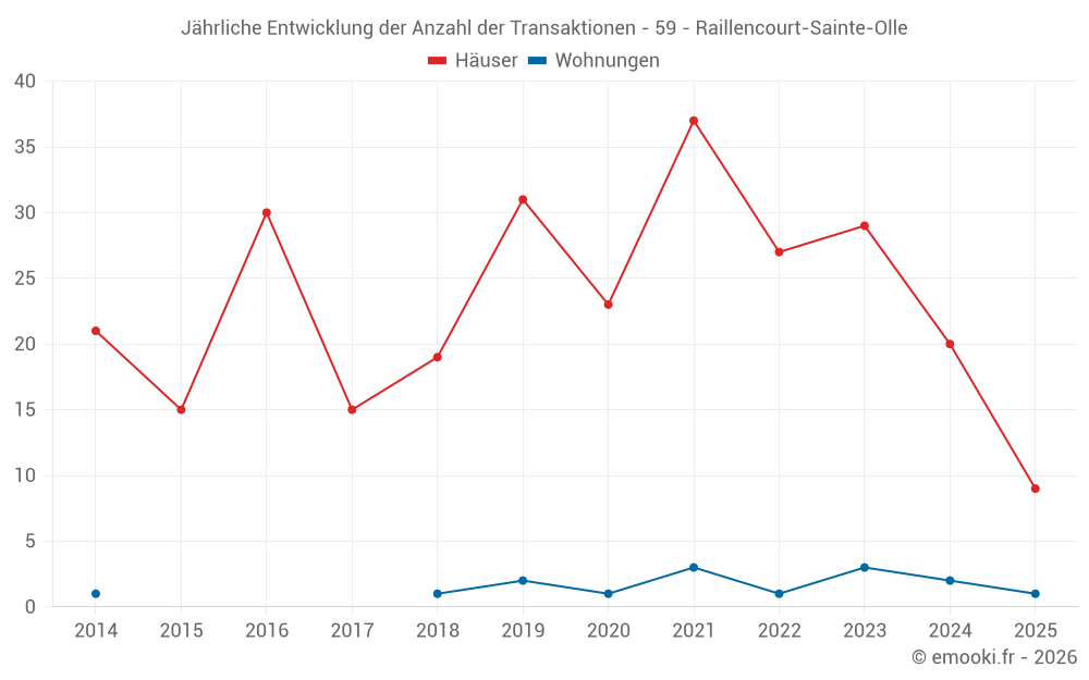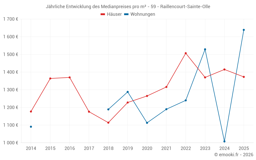 Der Durchschnittspreis auf den 19 Hausgeschäften der letzten 12 Monate in der Gemeinde Raillencourt-Sainte-Olle betrug 1 394 € pro Quadratmeter für einen mittleren Immobilienwert von 118 000 €. Über diesen Zeitraum hinweg lagen 60% der Transaktionen zwischen 1 052 und 1 940 € pro Quadratmeter (vom 2. bis zum 8. Dezil).