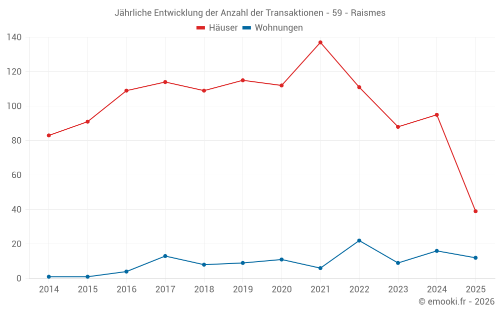 Der Durchschnittspreis auf den 39 Hausgeschäften der letzten 6 Monate in der Gemeinde Raismes betrug 1 318 € pro Quadratmeter für einen mittleren Immobilienwert von 110 000 €. Über diesen Zeitraum hinweg lagen 60% der Transaktionen zwischen 880 und 1 787 € pro Quadratmeter (vom 2. bis zum 8. Dezil).