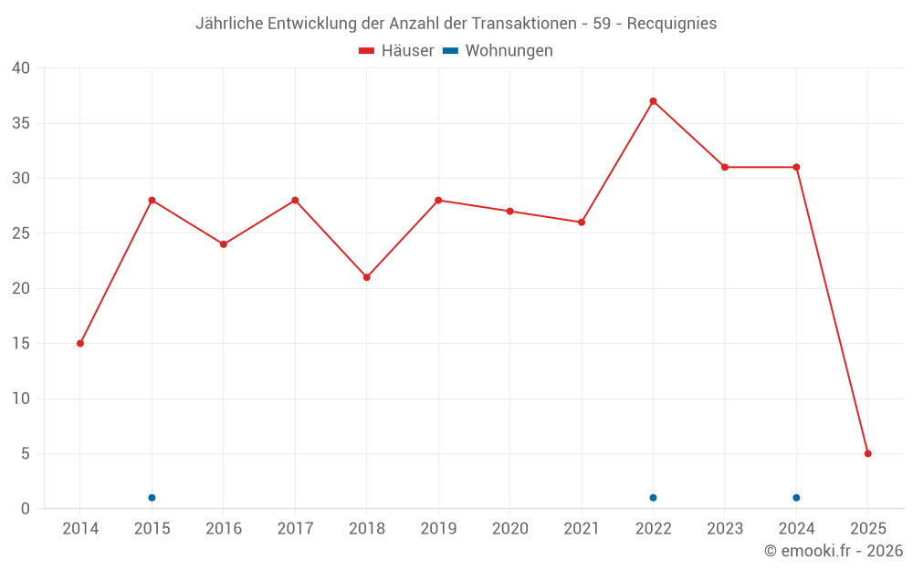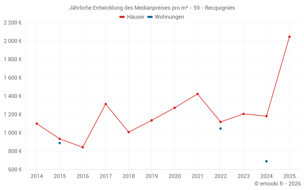 Der Durchschnittspreis auf den 24 Hausgeschäften der letzten 12 Monate in der Gemeinde Recquignies betrug 1 196 € pro Quadratmeter für einen mittleren Immobilienwert von 121 500 €. Über diesen Zeitraum hinweg lagen 60% der Transaktionen zwischen 807 und 1 621 € pro Quadratmeter (vom 2. bis zum 8. Dezil).