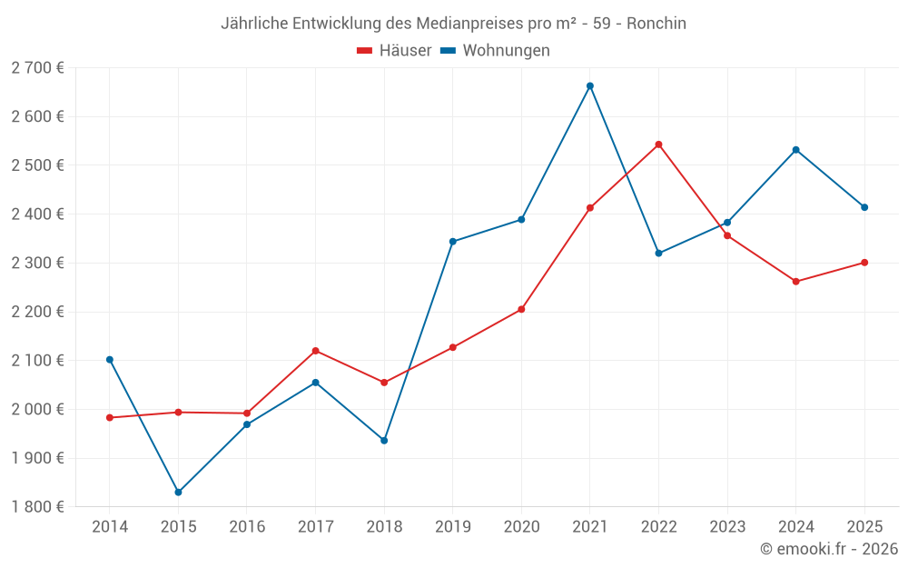Der Durchschnittspreis auf den 20 Wohnungstransaktionen der letzten 3 Monate in der Gemeinde Ronchin betrug 2 456 € pro Quadratmeter für einen mittleren Immobilienwert von 111 900 €. Über diesen Zeitraum hinweg lagen 60% der Transaktionen zwischen 2 143 und 2 837 € pro Quadratmeter (vom 2. bis zum 8. Dezil).