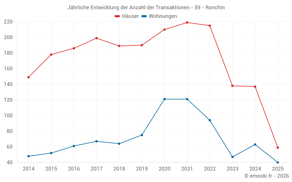 Der Durchschnittspreis auf den 24 Hausgeschäften der letzten 3 Monate in der Gemeinde Ronchin betrug 2 202 € pro Quadratmeter für einen mittleren Immobilienwert von 196 000 €. Über diesen Zeitraum hinweg lagen 60% der Transaktionen zwischen 1 638 und 2 941 € pro Quadratmeter (vom 2. bis zum 8. Dezil).