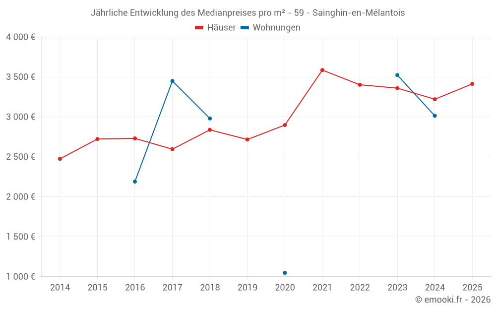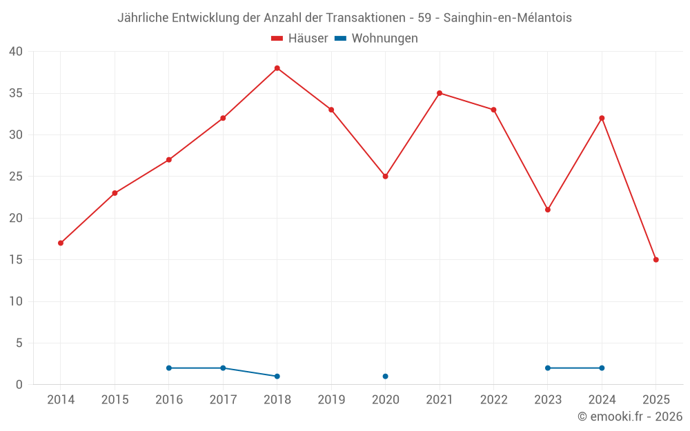 Der Durchschnittspreis auf den 32 Hausgeschäften der letzten 12 Monate in der Gemeinde Sainghin-en-Mélantois betrug 3 432 € pro Quadratmeter für einen mittleren Immobilienwert von 342 610 €. Über diesen Zeitraum hinweg lagen 60% der Transaktionen zwischen 2 564 und 4 149 € pro Quadratmeter (vom 2. bis zum 8. Dezil).