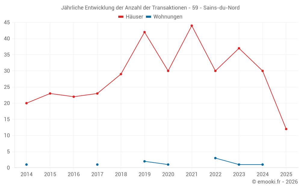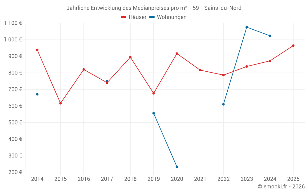 Der Durchschnittspreis auf den 29 Hausgeschäften der letzten 12 Monate in der Gemeinde Sains-du-Nord betrug 953 € pro Quadratmeter für einen mittleren Immobilienwert von 80 000 €. Über diesen Zeitraum hinweg lagen 60% der Transaktionen zwischen 691 und 1 179 € pro Quadratmeter (vom 2. bis zum 8. Dezil).
