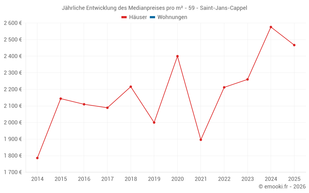 Der Durchschnittspreis auf den 24 Hausgeschäften der letzten 24 Monate in der Gemeinde Saint-Jans-Cappel betrug 2 288 € pro Quadratmeter für einen mittleren Immobilienwert von 218 750 €. Über diesen Zeitraum hinweg lagen 60% der Transaktionen zwischen 1 359 und 3 146 € pro Quadratmeter (vom 2. bis zum 8. Dezil).