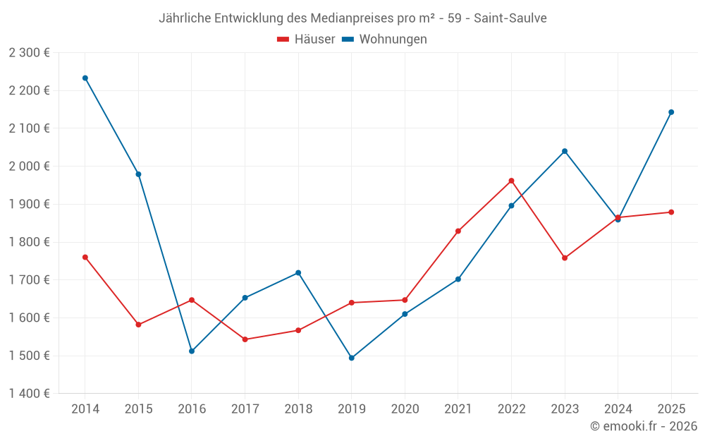 Der Durchschnittspreis auf den 21 Hausgeschäften der letzten 3 Monate in der Gemeinde Saint-Saulve betrug 1 739 € pro Quadratmeter für einen mittleren Immobilienwert von 168 000 €. Über diesen Zeitraum hinweg lagen 60% der Transaktionen zwischen 1 165 und 2 448 € pro Quadratmeter (vom 2. bis zum 8. Dezil).