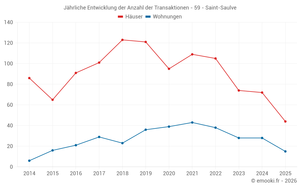 Der Durchschnittspreis auf den 27 Wohnungstransaktionen der letzten 12 Monate in der Gemeinde Saint-Saulve betrug 1 948 € pro Quadratmeter für einen mittleren Immobilienwert von 114 000 €. Über diesen Zeitraum hinweg lagen 60% der Transaktionen zwischen 1 707 und 2 321 € pro Quadratmeter (vom 2. bis zum 8. Dezil).
