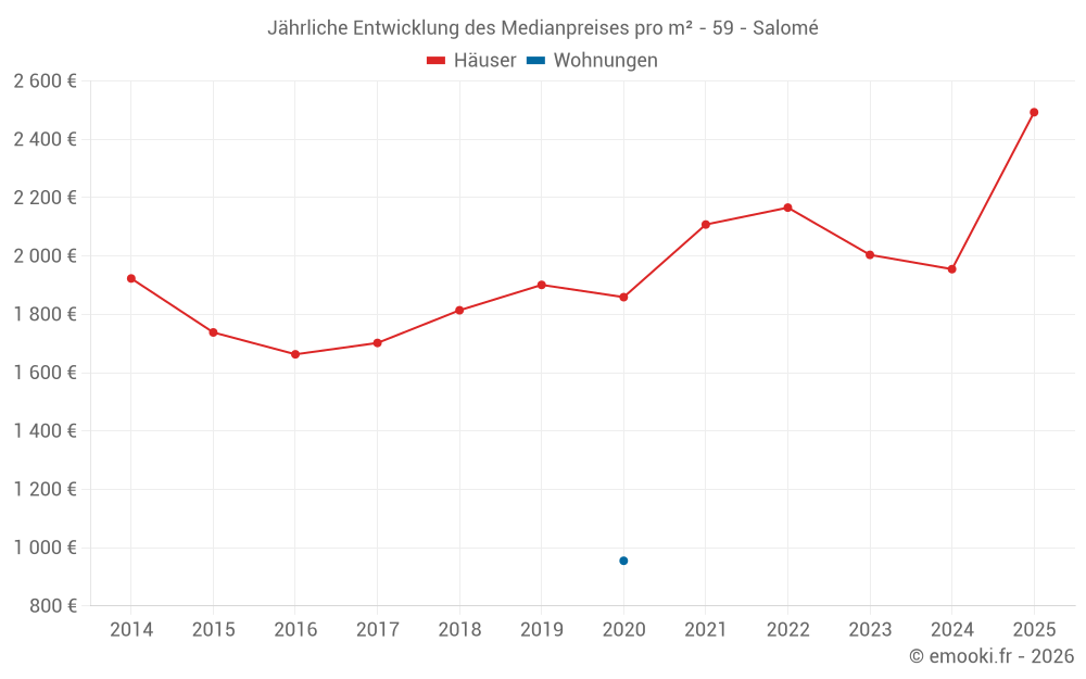 Der Durchschnittspreis auf den 41 Hausgeschäften der letzten 12 Monate in der Gemeinde Salomé betrug 2 063 € pro Quadratmeter für einen mittleren Immobilienwert von 176 228 €. Über diesen Zeitraum hinweg lagen 60% der Transaktionen zwischen 1 373 und 2 685 € pro Quadratmeter (vom 2. bis zum 8. Dezil).