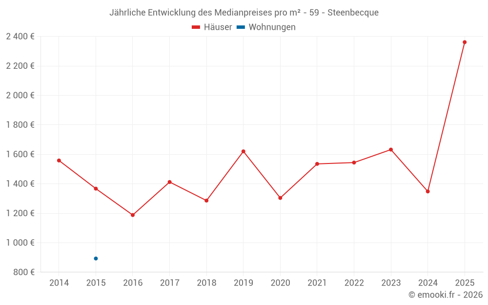 Der Durchschnittspreis auf den 32 Hausgeschäften der letzten 24 Monate in der Gemeinde Steenbecque betrug 1 532 € pro Quadratmeter für einen mittleren Immobilienwert von 154 750 €. Über diesen Zeitraum hinweg lagen 60% der Transaktionen zwischen 1 135 und 2 343 € pro Quadratmeter (vom 2. bis zum 8. Dezil).