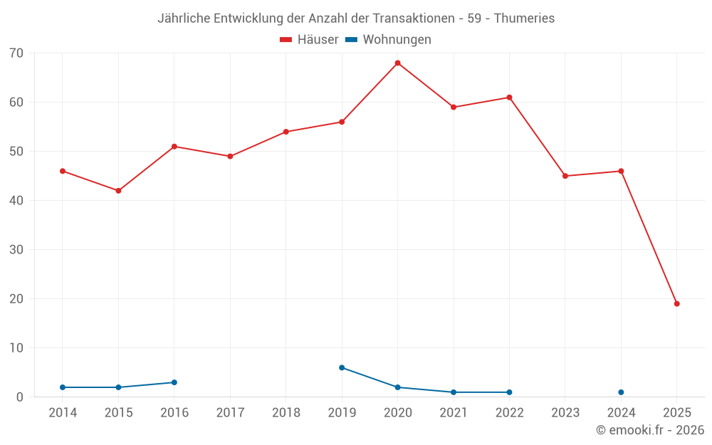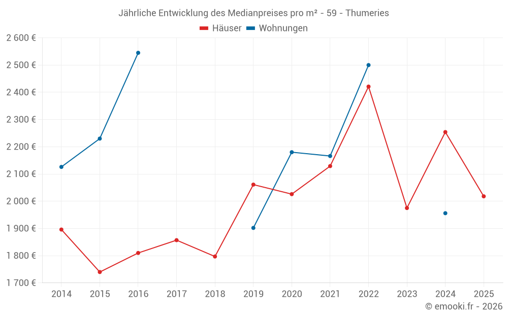 Der Durchschnittspreis auf den 19 Hausgeschäften der letzten 6 Monate in der Gemeinde Thumeries betrug 2 018 € pro Quadratmeter für einen mittleren Immobilienwert von 220 000 €. Über diesen Zeitraum hinweg lagen 60% der Transaktionen zwischen 1 736 und 2 938 € pro Quadratmeter (vom 2. bis zum 8. Dezil).