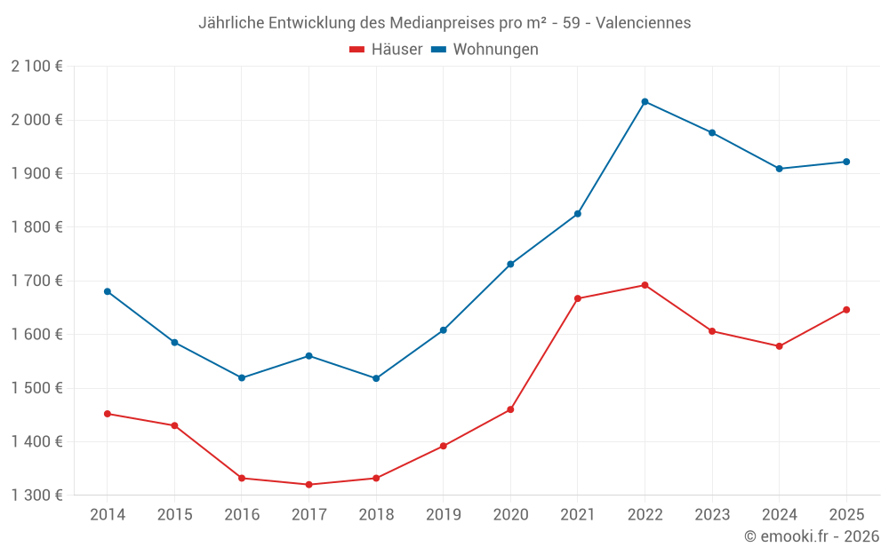 Der Durchschnittspreis auf den 84 Wohnungstransaktionen der letzten 3 Monate in der Gemeinde Valenciennes betrug 1 896 € pro Quadratmeter für einen mittleren Immobilienwert von 111 290 €. Über diesen Zeitraum hinweg lagen 60% der Transaktionen zwischen 1 508 und 2 330 € pro Quadratmeter (vom 2. bis zum 8. Dezil).