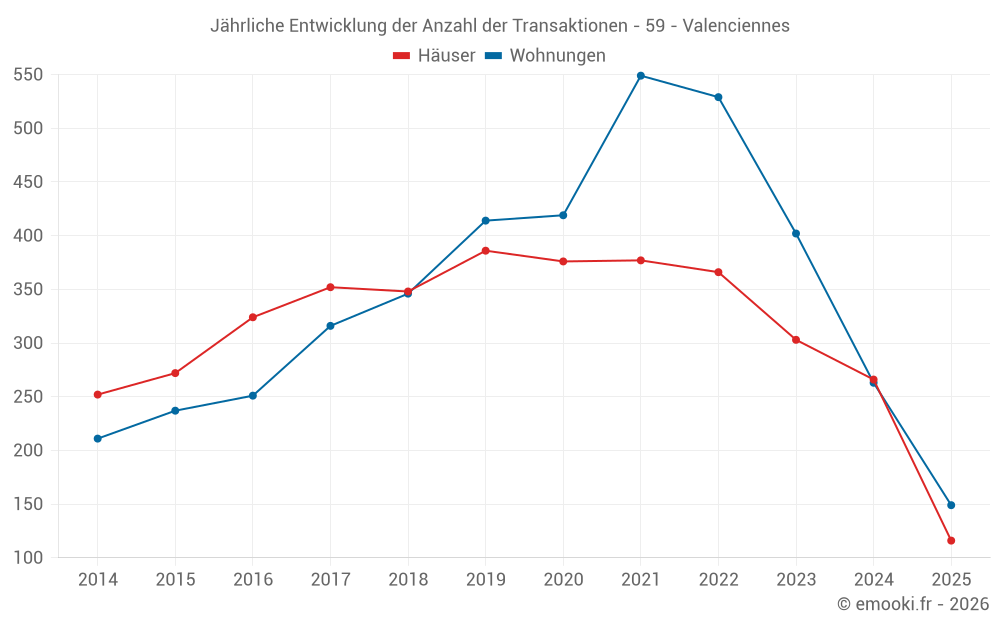 Der Durchschnittspreis auf den 42 Hausgeschäften der letzten 3 Monate in der Gemeinde Valenciennes betrug 1 502 € pro Quadratmeter für einen mittleren Immobilienwert von 149 750 €. Über diesen Zeitraum hinweg lagen 60% der Transaktionen zwischen 1 194 und 2 246 € pro Quadratmeter (vom 2. bis zum 8. Dezil).