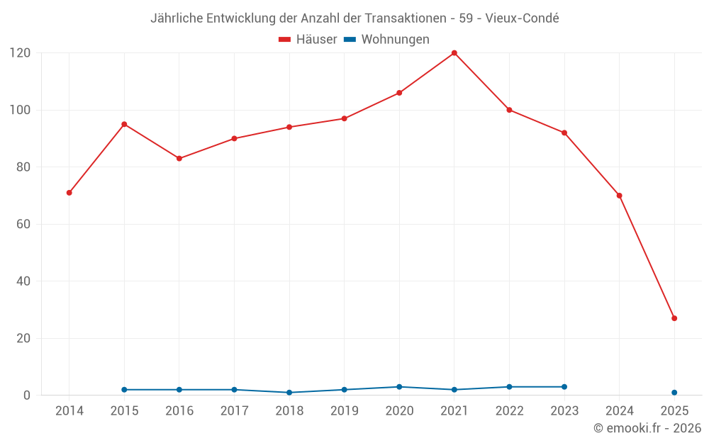 Der Durchschnittspreis auf den 27 Hausgeschäften der letzten 6 Monate in der Gemeinde Vieux-Condé betrug 1 188 € pro Quadratmeter für einen mittleren Immobilienwert von 124 000 €. Über diesen Zeitraum hinweg lagen 60% der Transaktionen zwischen 678 und 1 825 € pro Quadratmeter (vom 2. bis zum 8. Dezil).