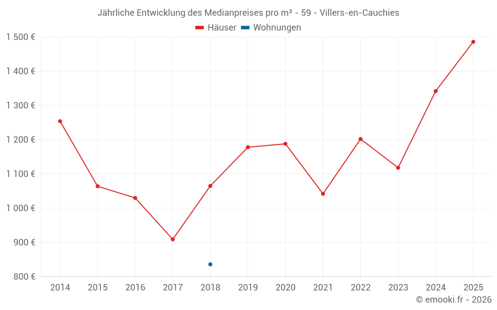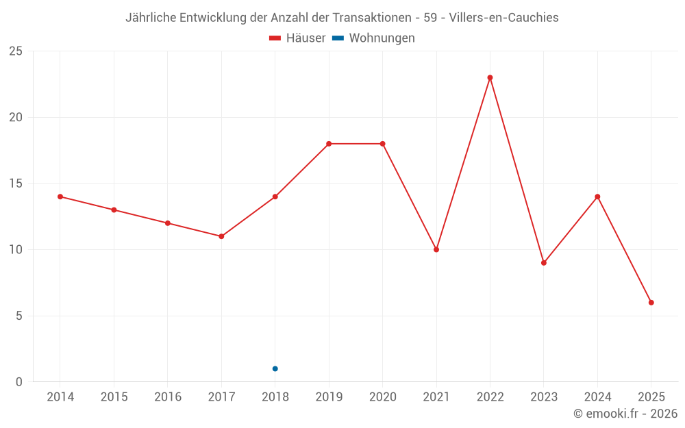 Der Durchschnittspreis auf den 23 Hausgeschäften der letzten 24 Monate in der Gemeinde Villers-en-Cauchies betrug 1 364 € pro Quadratmeter für einen mittleren Immobilienwert von 122 500 €. Über diesen Zeitraum hinweg lagen 60% der Transaktionen zwischen 971 und 1 881 € pro Quadratmeter (vom 2. bis zum 8. Dezil).