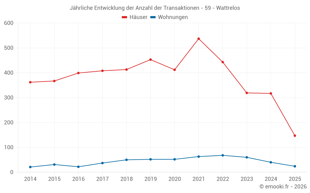Der Durchschnittspreis auf den 60 Hausgeschäften der letzten 3 Monate in der Gemeinde Wattrelos betrug 2 000 € pro Quadratmeter für einen mittleren Immobilienwert von 177 795 €. Über diesen Zeitraum hinweg lagen 60% der Transaktionen zwischen 1 470 und 2 721 € pro Quadratmeter (vom 2. bis zum 8. Dezil).
