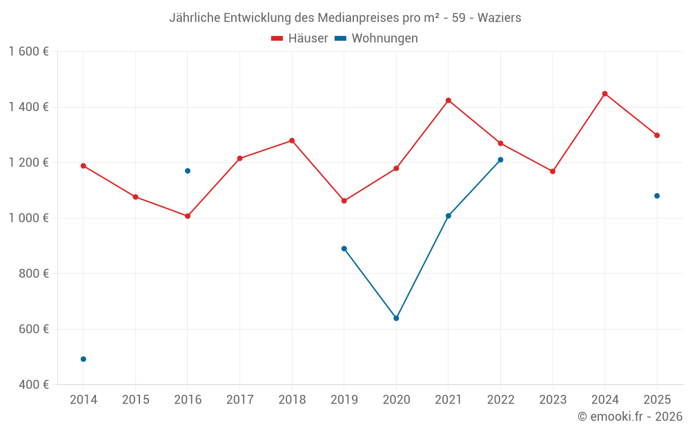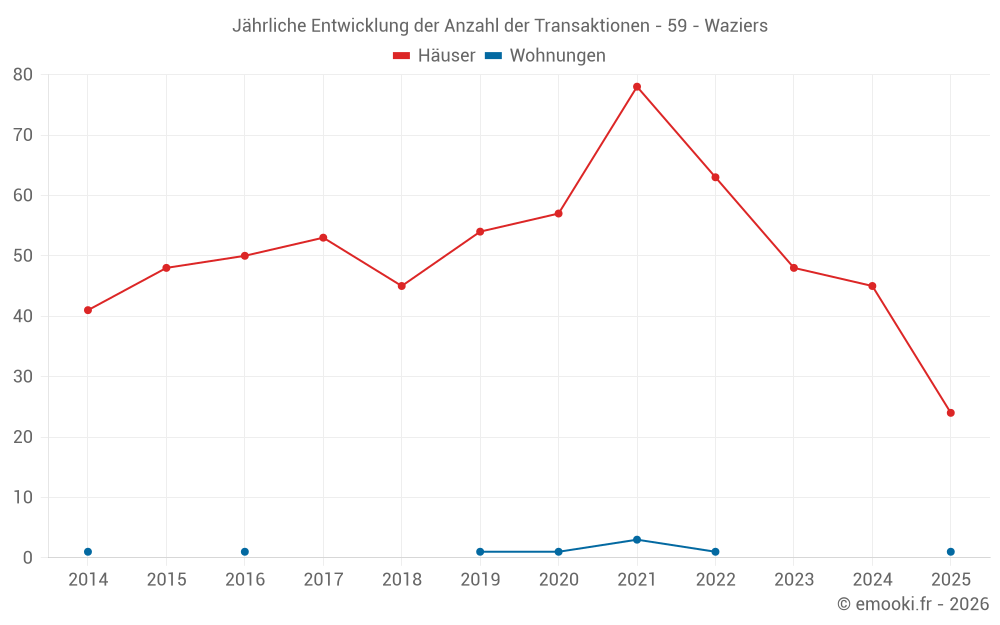 Der Durchschnittspreis auf den 24 Hausgeschäften der letzten 6 Monate in der Gemeinde Waziers betrug 1 298 € pro Quadratmeter für einen mittleren Immobilienwert von 152 250 €. Über diesen Zeitraum hinweg lagen 60% der Transaktionen zwischen 970 und 1 609 € pro Quadratmeter (vom 2. bis zum 8. Dezil).