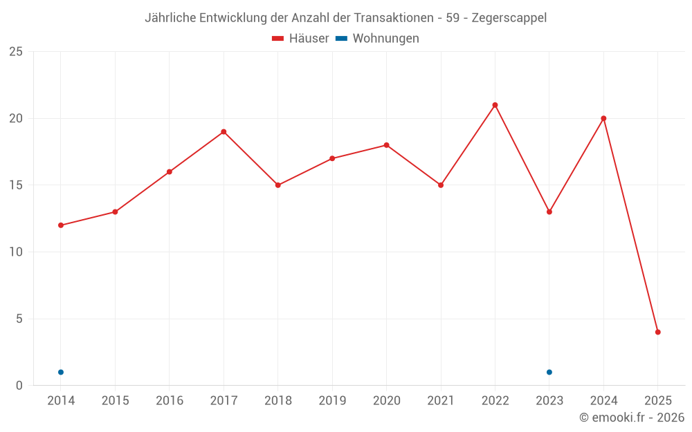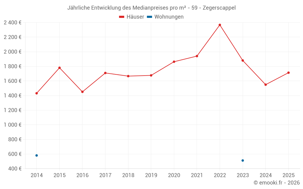 Der Durchschnittspreis auf den 32 Hausgeschäften der letzten 24 Monate in der Gemeinde Zegerscappel betrug 1 791 € pro Quadratmeter für einen mittleren Immobilienwert von 183 675 €. Über diesen Zeitraum hinweg lagen 60% der Transaktionen zwischen 1 067 und 2 464 € pro Quadratmeter (vom 2. bis zum 8. Dezil).