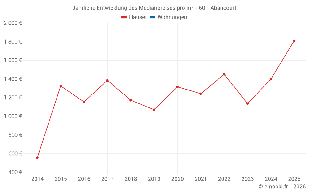 Der Durchschnittspreis auf den 14 Hausgeschäften der letzten 24 Monate in der Gemeinde Abancourt betrug 1 608 € pro Quadratmeter für einen mittleren Immobilienwert von 126 000 €. Über diesen Zeitraum hinweg lagen 60% der Transaktionen zwischen 943 und 1 806 € pro Quadratmeter (vom 2. bis zum 8. Dezil).