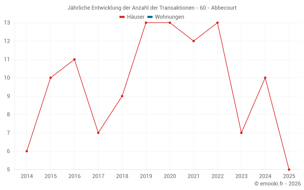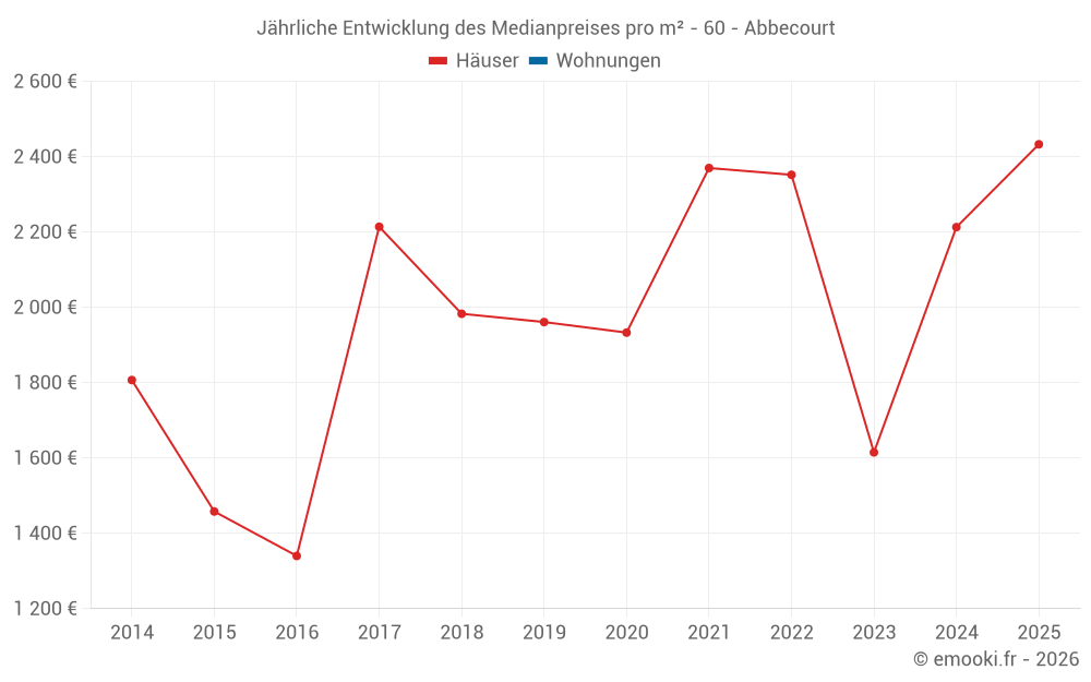 Der Durchschnittspreis auf den 19 Hausgeschäften der letzten 24 Monate in der Gemeinde Abbecourt betrug 2 209 € pro Quadratmeter für einen mittleren Immobilienwert von 210 000 €. Über diesen Zeitraum hinweg lagen 60% der Transaktionen zwischen 1 563 und 2 544 € pro Quadratmeter (vom 2. bis zum 8. Dezil).