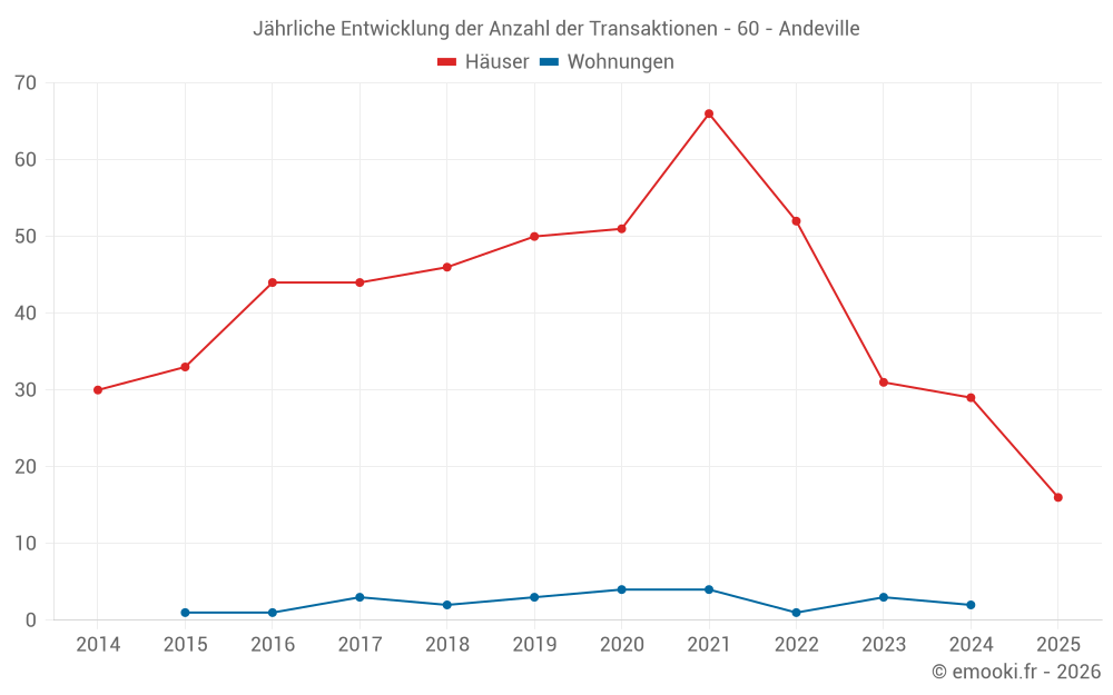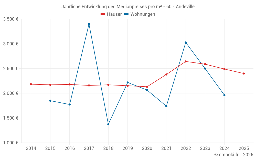Der Durchschnittspreis auf den 35 Hausgeschäften der letzten 12 Monate in der Gemeinde Andeville betrug 2 385 € pro Quadratmeter für einen mittleren Immobilienwert von 215 000 €. Über diesen Zeitraum hinweg lagen 60% der Transaktionen zwischen 1 890 und 2 773 € pro Quadratmeter (vom 2. bis zum 8. Dezil).