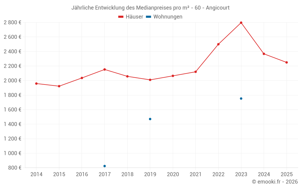 Der Durchschnittspreis auf den 28 Hausgeschäften der letzten 24 Monate in der Gemeinde Angicourt betrug 2 366 € pro Quadratmeter für einen mittleren Immobilienwert von 228 450 €. Über diesen Zeitraum hinweg lagen 60% der Transaktionen zwischen 2 004 und 2 921 € pro Quadratmeter (vom 2. bis zum 8. Dezil).