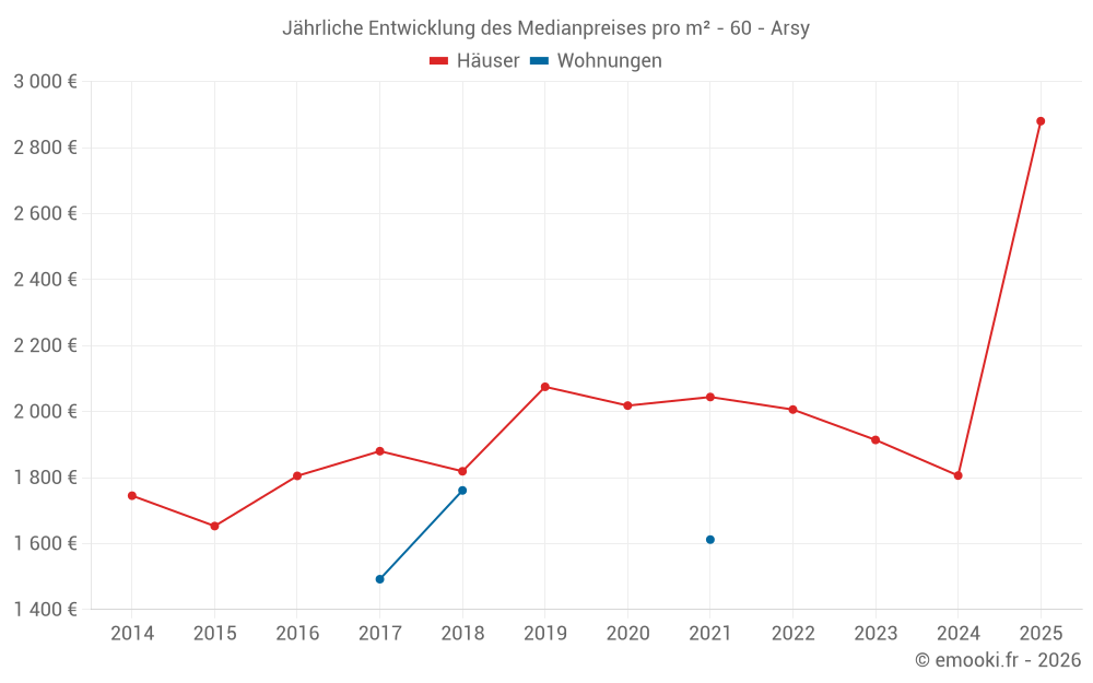 Der Durchschnittspreis auf den 14 Hausgeschäften der letzten 24 Monate in der Gemeinde Arsy betrug 2 171 € pro Quadratmeter für einen mittleren Immobilienwert von 234 075 €. Über diesen Zeitraum hinweg lagen 60% der Transaktionen zwischen 1 802 und 2 586 € pro Quadratmeter (vom 2. bis zum 8. Dezil).