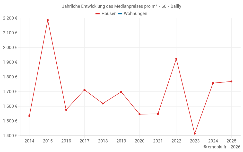 Der Durchschnittspreis auf den 16 Hausgeschäften der letzten 24 Monate in der Gemeinde Bailly betrug 1 422 € pro Quadratmeter für einen mittleren Immobilienwert von 189 167 €. Über diesen Zeitraum hinweg lagen 60% der Transaktionen zwischen 1 133 und 2 046 € pro Quadratmeter (vom 2. bis zum 8. Dezil).