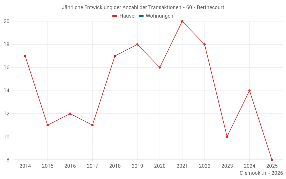 Der Durchschnittspreis auf den 27 Hausgeschäften der letzten 24 Monate in der Gemeinde Berthecourt betrug 2 381 € pro Quadratmeter für einen mittleren Immobilienwert von 225 000 €. Über diesen Zeitraum hinweg lagen 60% der Transaktionen zwischen 1 710 und 2 940 € pro Quadratmeter (vom 2. bis zum 8. Dezil).