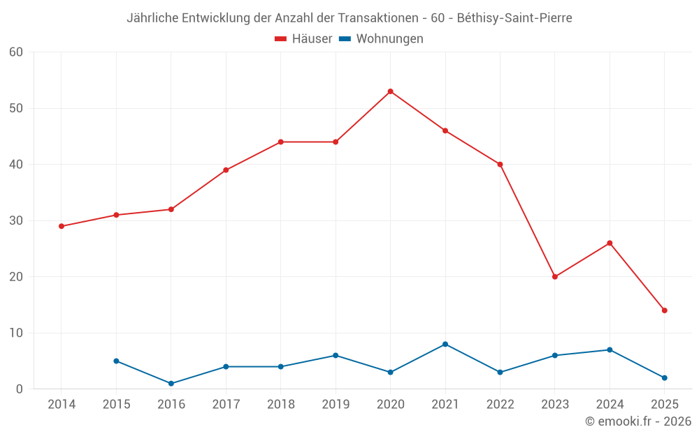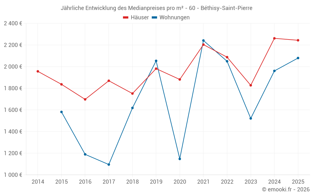 Der Durchschnittspreis auf den 26 Hausgeschäften der letzten 12 Monate in der Gemeinde Béthisy-Saint-Pierre betrug 2 218 € pro Quadratmeter für einen mittleren Immobilienwert von 183 900 €. Über diesen Zeitraum hinweg lagen 60% der Transaktionen zwischen 1 538 und 2 552 € pro Quadratmeter (vom 2. bis zum 8. Dezil).
