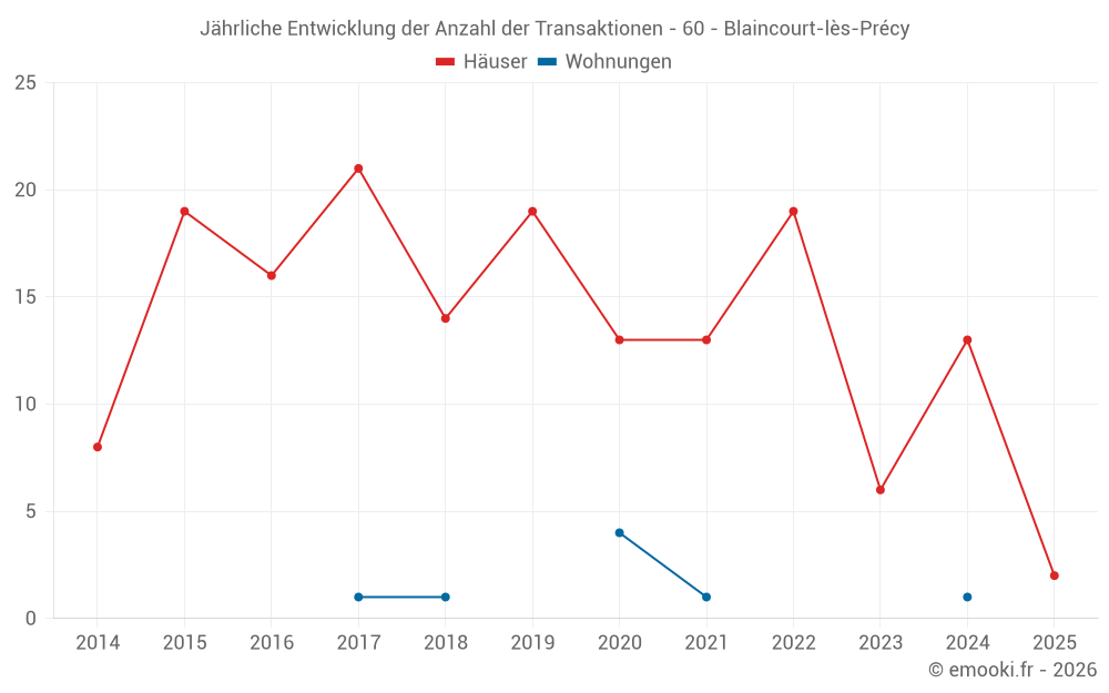 Der Durchschnittspreis auf den 18 Hausgeschäften der letzten 24 Monate in der Gemeinde Blaincourt-lès-Précy betrug 3 142 € pro Quadratmeter für einen mittleren Immobilienwert von 270 000 €. Über diesen Zeitraum hinweg lagen 60% der Transaktionen zwischen 2 741 und 3 480 € pro Quadratmeter (vom 2. bis zum 8. Dezil).