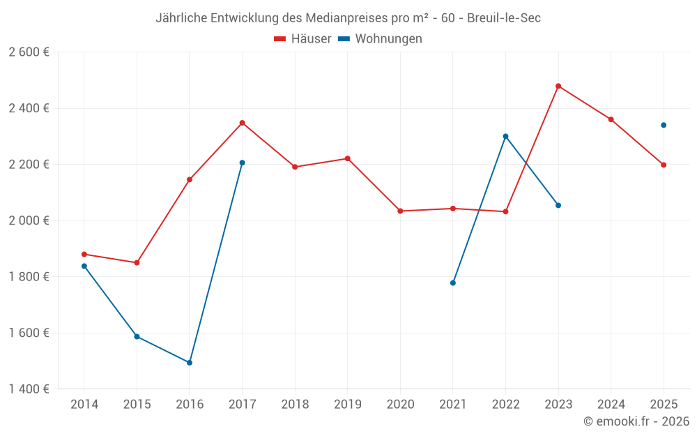 Der Durchschnittspreis auf den 18 Hausgeschäften der letzten 6 Monate in der Gemeinde Breuil-le-Sec betrug 2 198 € pro Quadratmeter für einen mittleren Immobilienwert von 187 500 €. Über diesen Zeitraum hinweg lagen 60% der Transaktionen zwischen 1 536 und 2 671 € pro Quadratmeter (vom 2. bis zum 8. Dezil).