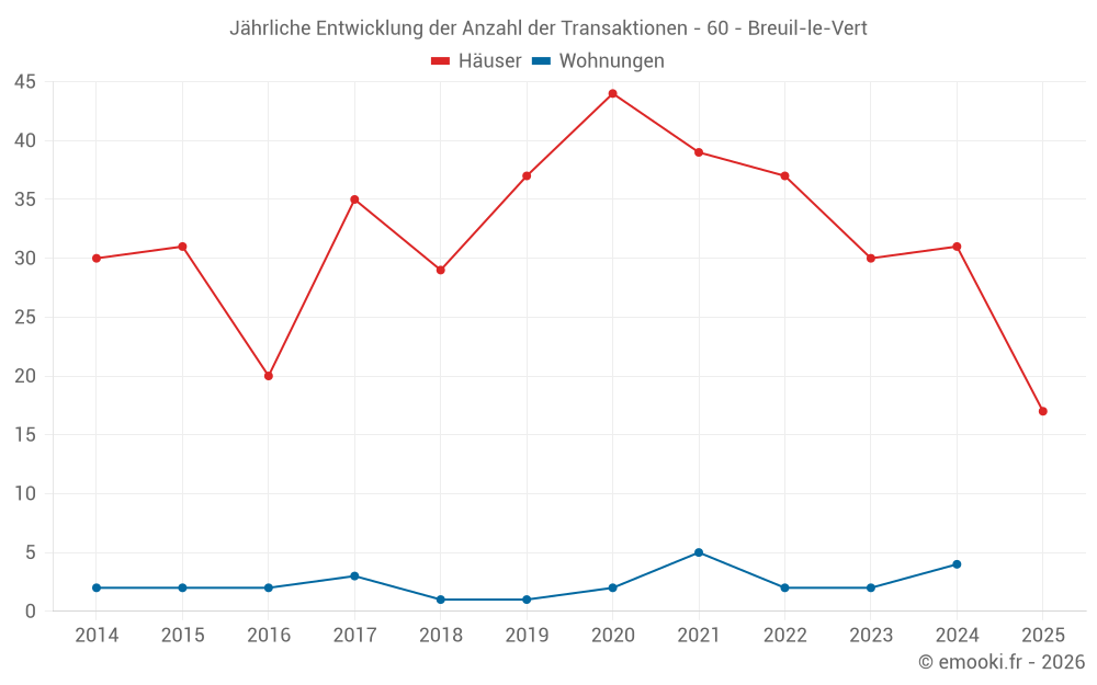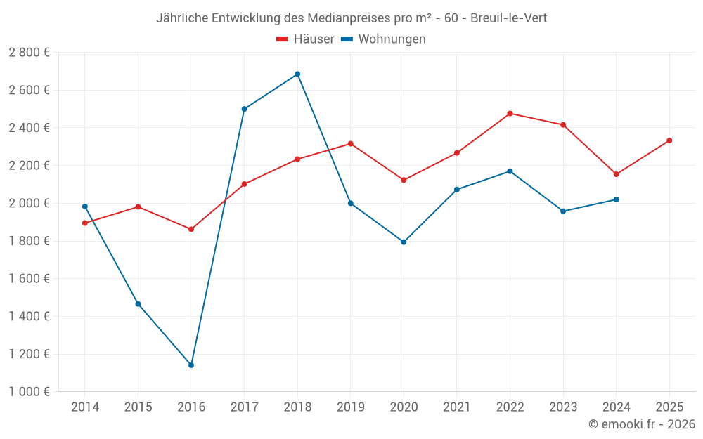 Der Durchschnittspreis auf den 35 Hausgeschäften der letzten 12 Monate in der Gemeinde Breuil-le-Vert betrug 2 276 € pro Quadratmeter für einen mittleren Immobilienwert von 220 000 €. Über diesen Zeitraum hinweg lagen 60% der Transaktionen zwischen 2 067 und 2 761 € pro Quadratmeter (vom 2. bis zum 8. Dezil).