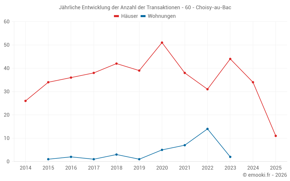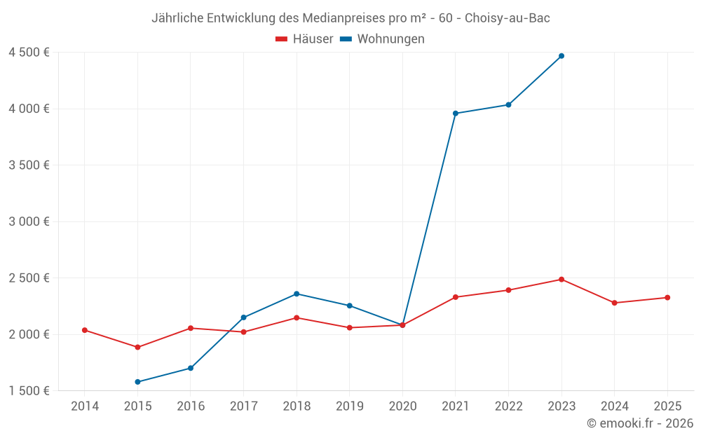 Der Durchschnittspreis auf den 25 Hausgeschäften der letzten 12 Monate in der Gemeinde Choisy-au-Bac betrug 2 338 € pro Quadratmeter für einen mittleren Immobilienwert von 192 000 €. Über diesen Zeitraum hinweg lagen 60% der Transaktionen zwischen 1 729 und 2 628 € pro Quadratmeter (vom 2. bis zum 8. Dezil).