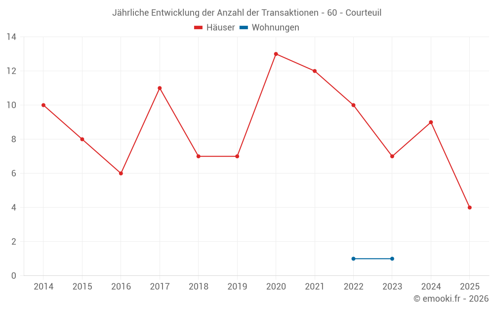 Der Durchschnittspreis auf den 18 Hausgeschäften der letzten 24 Monate in der Gemeinde Courteuil betrug 3 414 € pro Quadratmeter für einen mittleren Immobilienwert von 361 850 €. Über diesen Zeitraum hinweg lagen 60% der Transaktionen zwischen 2 902 und 4 182 € pro Quadratmeter (vom 2. bis zum 8. Dezil).