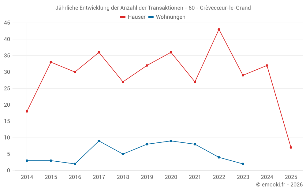 Der Durchschnittspreis auf den 27 Hausgeschäften der letzten 12 Monate in der Gemeinde Crèvecœur-le-Grand betrug 1 747 € pro Quadratmeter für einen mittleren Immobilienwert von 145 000 €. Über diesen Zeitraum hinweg lagen 60% der Transaktionen zwischen 1 124 und 2 187 € pro Quadratmeter (vom 2. bis zum 8. Dezil).