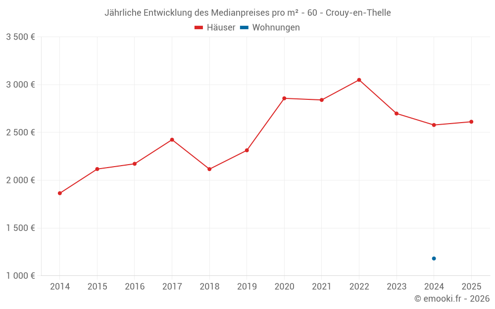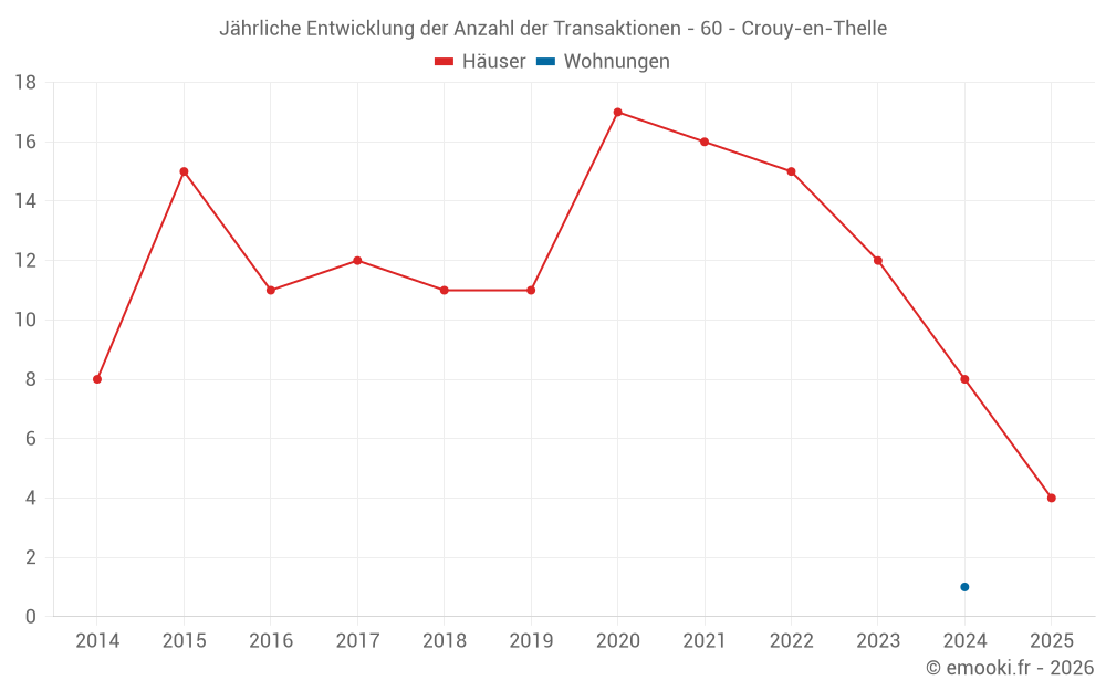 Der Durchschnittspreis auf den 18 Hausgeschäften der letzten 24 Monate in der Gemeinde Crouy-en-Thelle betrug 2 700 € pro Quadratmeter für einen mittleren Immobilienwert von 254 500 €. Über diesen Zeitraum hinweg lagen 60% der Transaktionen zwischen 2 104 und 3 723 € pro Quadratmeter (vom 2. bis zum 8. Dezil).
