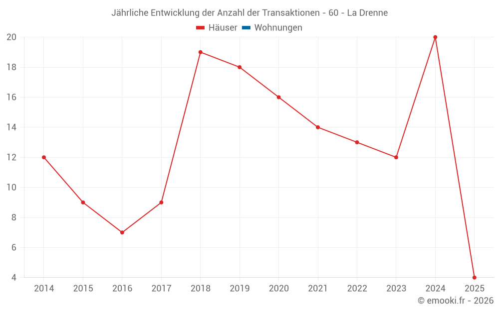 Der Durchschnittspreis auf den 32 Hausgeschäften der letzten 24 Monate in der Gemeinde La Drenne betrug 2 161 € pro Quadratmeter für einen mittleren Immobilienwert von 220 950 €. Über diesen Zeitraum hinweg lagen 60% der Transaktionen zwischen 1 754 und 2 658 € pro Quadratmeter (vom 2. bis zum 8. Dezil).